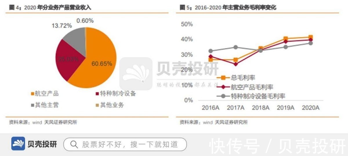航空主营业务快速发展,产品结构调整带动盈利。 2020年,公司实现营业收入8.31亿元,同比增长23.20%;实现归属于母公司的净利润1.94亿元,同比增长71.31%。产品方面,公司2020年航空产品收入5.04亿元,同比增长23.49%,占主营业务收入的61.03%,毛利率39.71%。同时,公司积极推进航空装备全生命周期服务保障,开拓发动机领域高附加值产品市场,挖掘维修服务市场潜力,实现营业收入1.14亿元在维修等业务中,全年同比增长53.59%。另一项主营业务为特种制冷业务,加强市场资源配置,拓展军用产品市场。 2020年全年实现营业收入2.08亿元,同比增长10.2%,占主营业务收入的25.19%,毛利率37.57%。 2020年公司主营航空业务将实现快速发展。归属于母公司的净利润增速高于营业收入增速,主要得益于航空制氧系统结构调整和高利润产品占比提升。